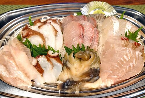白糠山内水産さんのお刺身左からハッカク(ルイベ)、ヤナギダコ、モミダコ(やまかん特製)、カンパチ(これだけ宮崎産)、ホッキ、オヒョウ、アカガレイ 嵯城商店さんおすすめのお燗で美味い日本酒と お隣さんから頂きもののローストポーク皮パリパリで旨…