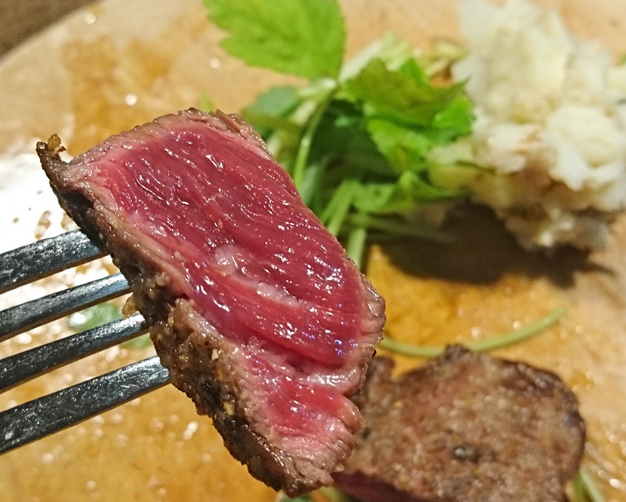 写真ではほとんど生のように写ってしまっているけれど、きちんと必要な火が通っているので柔らかく噛み切れて、お肉の旨みが楽しめます