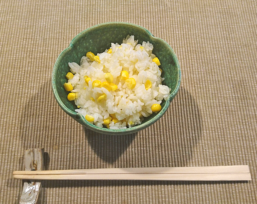 トウモロコシの芯とヒゲも全部入れて炊き上げるコーンライス
