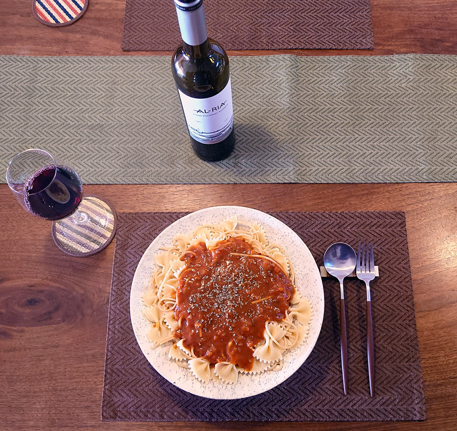 2024-11-16 ミートソースパスタ ひとりごはん ブランチ お昼は、半端な残りパスタをいっしょに調理在庫のミートソース1缶を温めて使用 2種類のパスタは合わせて200g弱 出来上がり 昨夜の残りワインとともに、いただきますけっこうペロリと平らげて ごちそうさまでした